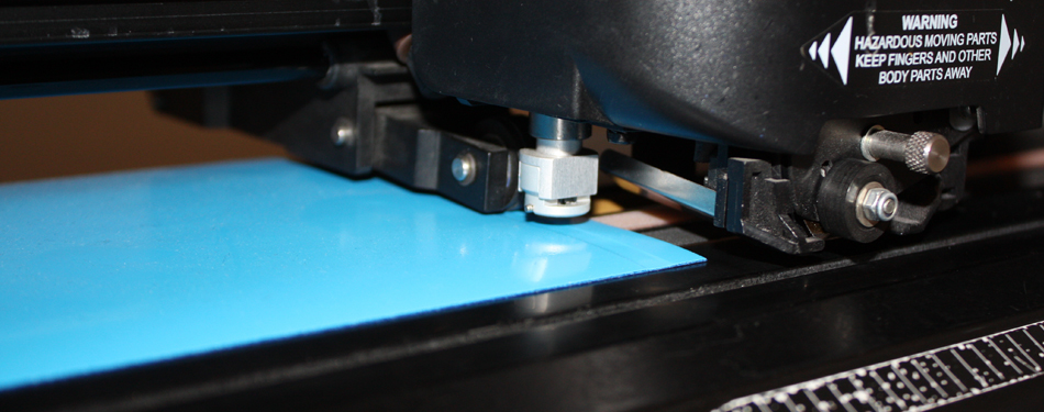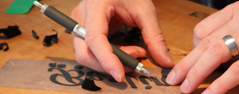 Bei der Herstellung werden die Schriften und Logos mit einem Schneidplotter